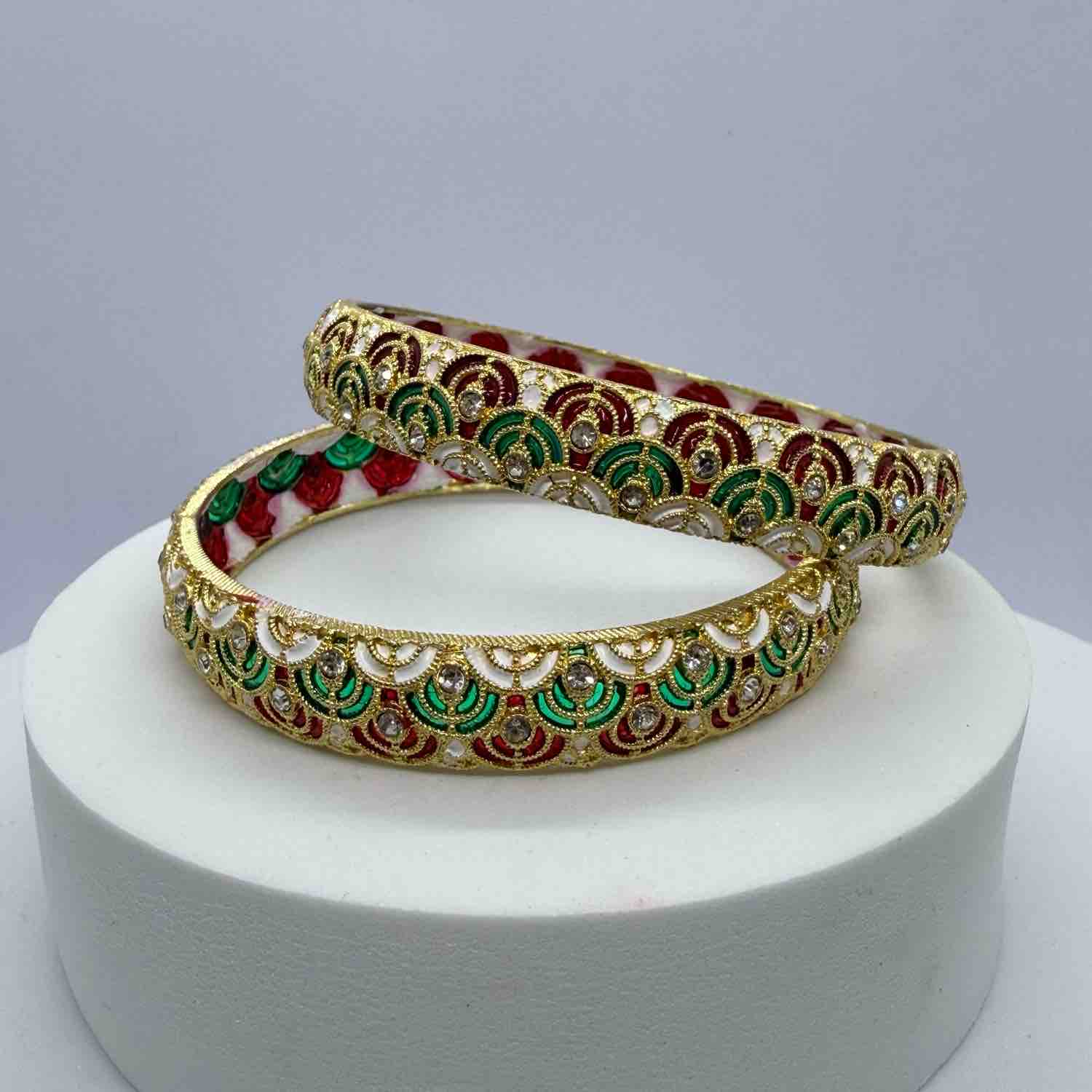 Elevate your traditional ensemble with these exquisite brass kada bangles, masterfully crafted to blend timeless elegance with contemporary flair. Featuring a striking white and multicolor finish, each bangle showcases intricate detailing that catches light beautifully, making them perfect for both festive occasions and everyday wear. The durable brass construction ensures longevity while maintaining its lustrous appeal. These versatile kadas complement traditional attire seamlessly and can be layered for a more dramatic effect. An essential addition to any jewelry collection, they offer authentic craftsmanship with a modern aesthetic that resonates with discerning style enthusiasts.