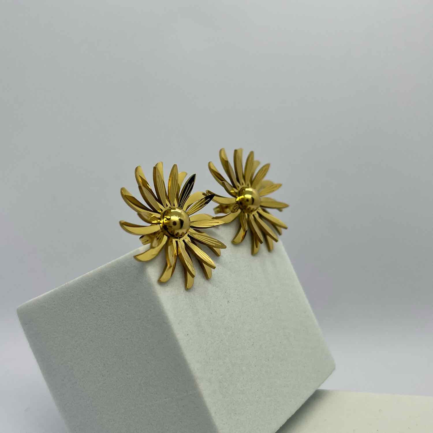 These gold-plated flower geometric earrings combine timeless elegance with a retro flair. Featuring a sun flower design, they offer a sophisticated stud style that enhances any outfit. Crafted with precision, these earrings provide a subtle yet striking accessory suitable for both everyday wear and special occasions. Their durable plating ensures lasting shine and comfort, making them a refined choice for those seeking understated elegance with a classic touch.