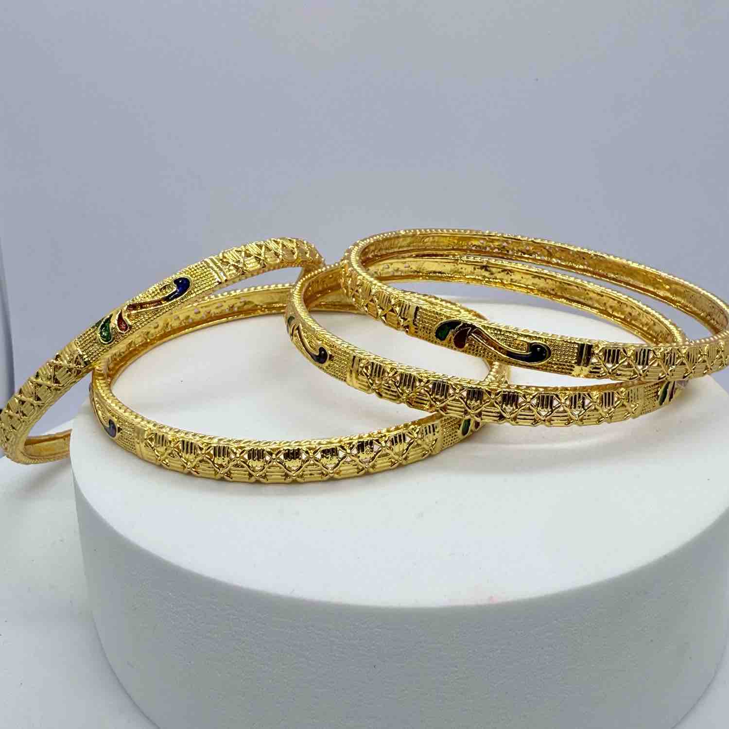 Elevate your ethnic wardrobe with this exquisite two-piece brass bangle set, inspired by the majestic peacock motif. Crafted from premium brass, these traditional bangles showcase intricate detailing that captures the elegance of classic Indian jewelry design. Perfect for women and girls alike, this versatile set complements both everyday wear and festive occasions. The durable brass construction ensures longevity, while the timeless peacock-inspired pattern adds a touch of sophistication to any ensemble. Ideal for gifting or personal collection.